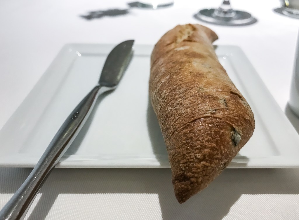 第四道料理是今日的Bread「橄欖麵包」。整條的橄欖麵包經過烤後十分香脆,麵包裡穿插著黑橄欖同時散發黑橄欖的鹹香味,我沾點海鹽奶油,又會帶有些香酥氣息,重要的是不會太硬而傷口。搭配葡萄酒,十分穩定,葡萄酒果香舒適優雅,麵包微脆中帶著清香的氣息。