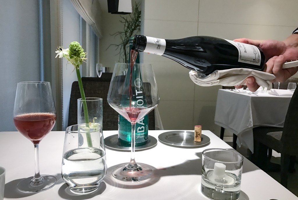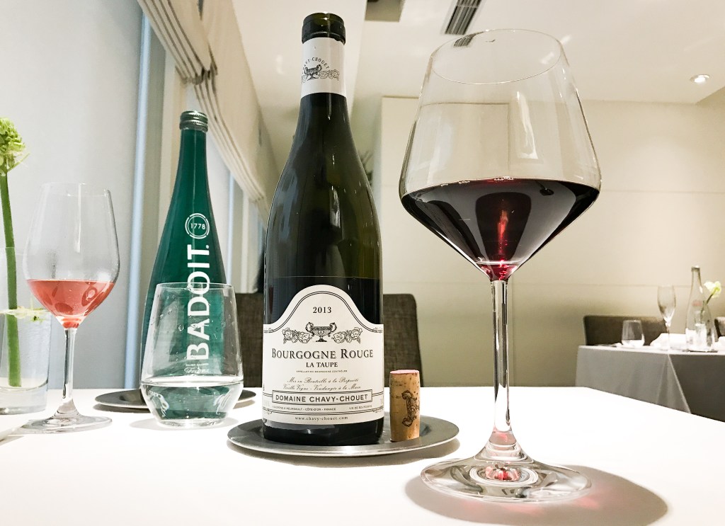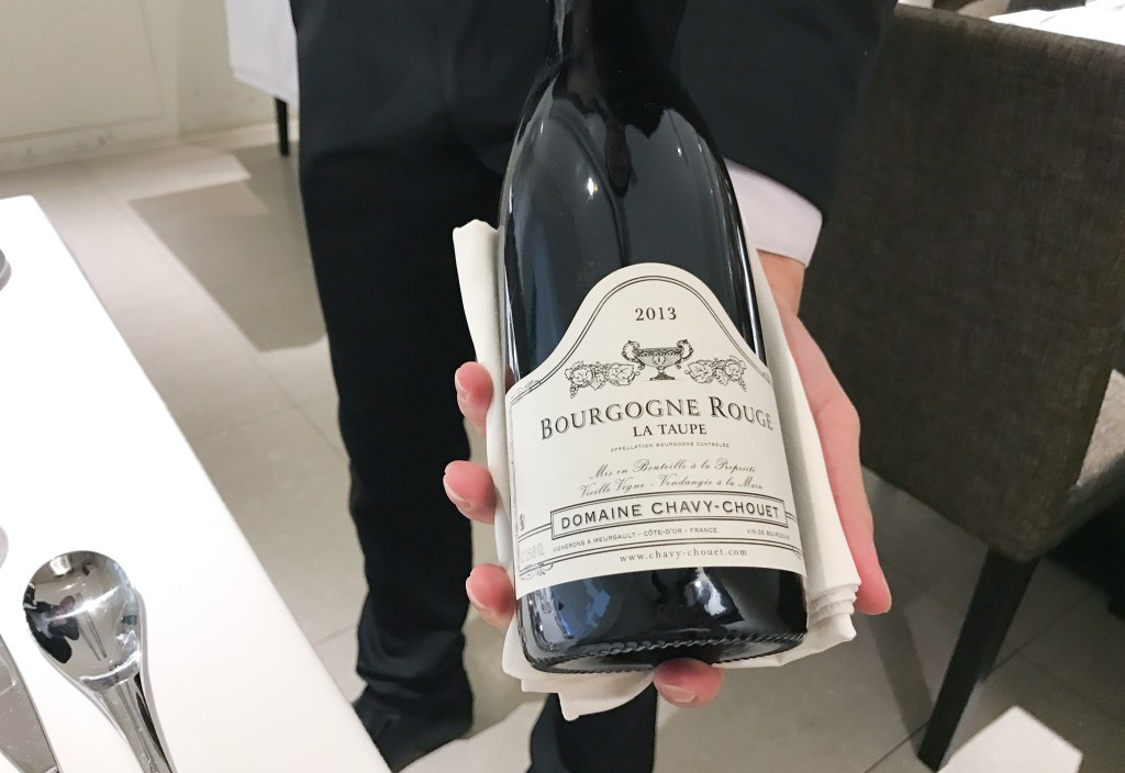 好的,待一切安定後,我向服務人員要了酒單,瀏覽之後,決定選擇DOMAINE CHAVY-CHOUET BOURGOGNE LA TAUPE 2013。理由是什麼?老實說,能夠上了酒單不在乎貴賤,水準一定穩當,同時也考驗了侍酒師的智慧與能力。此外,原本也只是想解解饞,但品味與搭餐後卻是意外驚艷,這裡的選酒是如此美好。