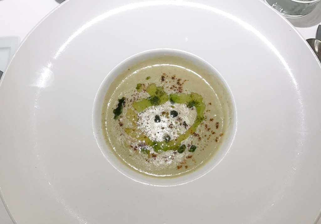 第二道料理是Le velouté de potiron au bacon Pumpkin velvety with bacon「法式蔬菜濃湯」。濃濃稠偏芥末黃的湯品,外層傻上些許巴斯克辣粉還有淋上蔬菜油,我攪拌後,溫熱而飄出濃郁鹹香的氣息。我喝上一口,感受到稠密的滋味。這特別的口感介於一種勻稱,沒有厚重的蔬菜味,淡雅而自然。