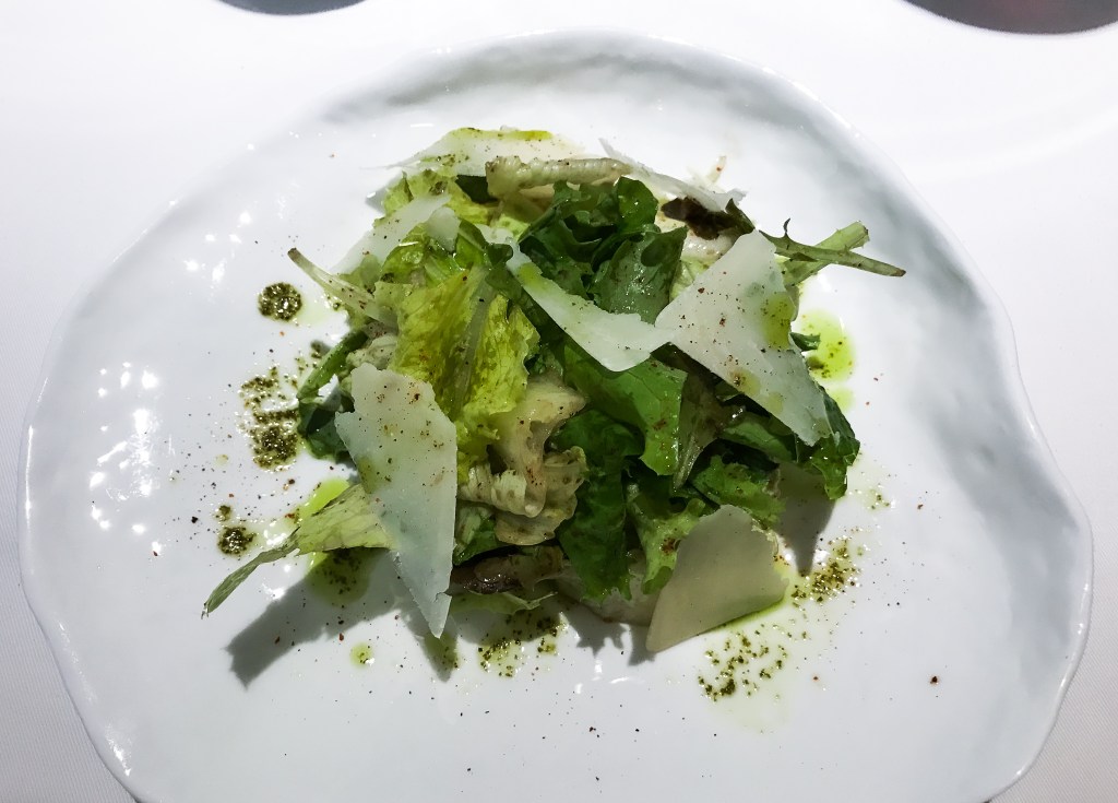 第三道料理是Mesclun de salade Salad mix with parmesan「精選沙拉佐帕馬森起司及巴薩米克油醋醬汁」。這道沙拉,有很種綠葉,還有蘿蔓、帕瑪起士,橄欖油、蔬菜油等,用叉子搖起吃下,十分家常而清爽。