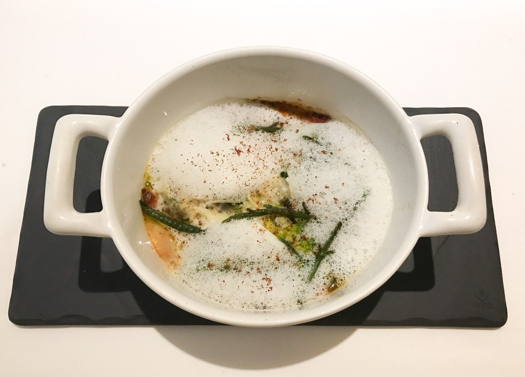 緊接著第五道料理是Les oeufs en cocotte et garniture de saison Egg baked in cocotte「 焗烤水波蛋洋蔥」。看看,有大蒜泡沫、燉菜是花椰、洋蔥、番茄與水波蛋等,在一款另我滿意愉快的小盅料理,家常而引發誘人的氣息。尤其搗破蛋後,蛋黃與蛋白在燉菜中而混屯,又出現的一點稠而帶濕潤的樣子,這款我只能說真好吃。