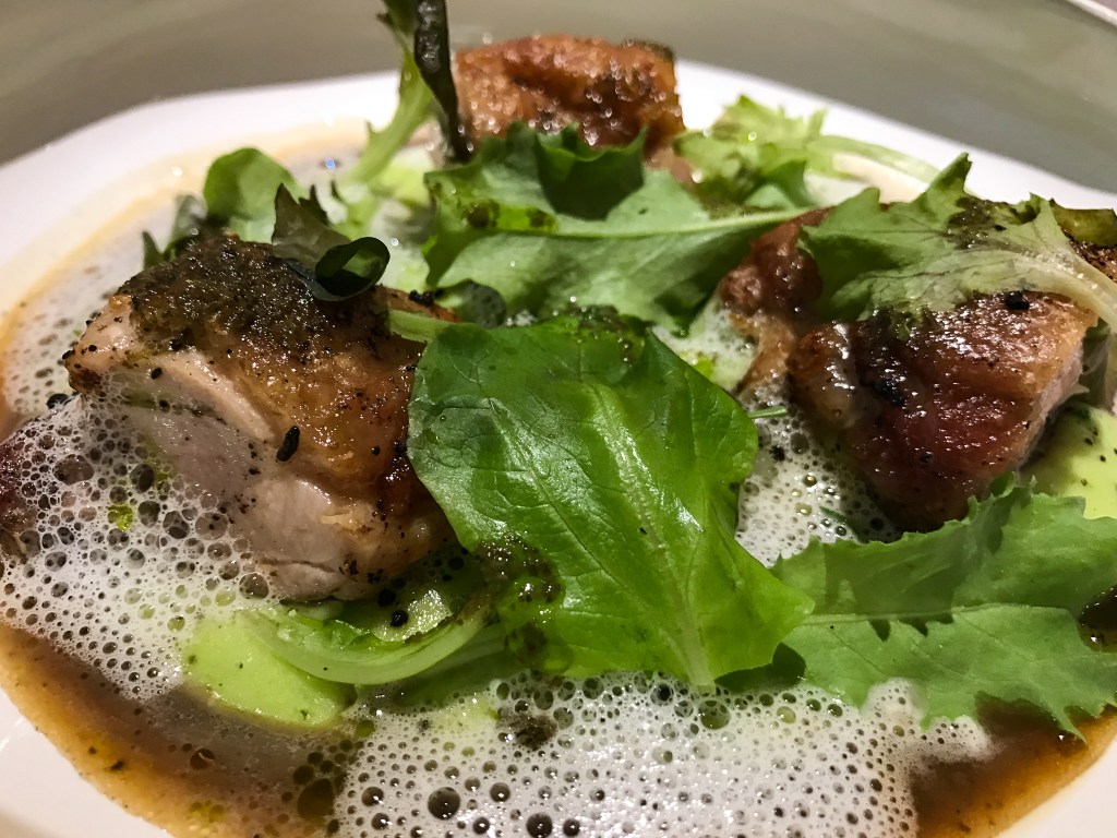 第六道菜是今日主餐La cuisse de volaille, crème pomme de terre aux herbes et condiments. Un jus Poultry leg slow cooked , potato cream with herbs「桂丁雞佐香草馬鈴薯」。桂丁雞還有雞大骨湯汁,水菜、洋蔥燉汁、巴西利葉與瑪鈴薯泥襯底。桂丁雞的口感與脆皮好極了,雞肉處理十分嫩而且表現出雞汁鎖於肉內的愉快。配上薯泥,香稠濃密可口,尤其整體滋味的融入真的優雅。