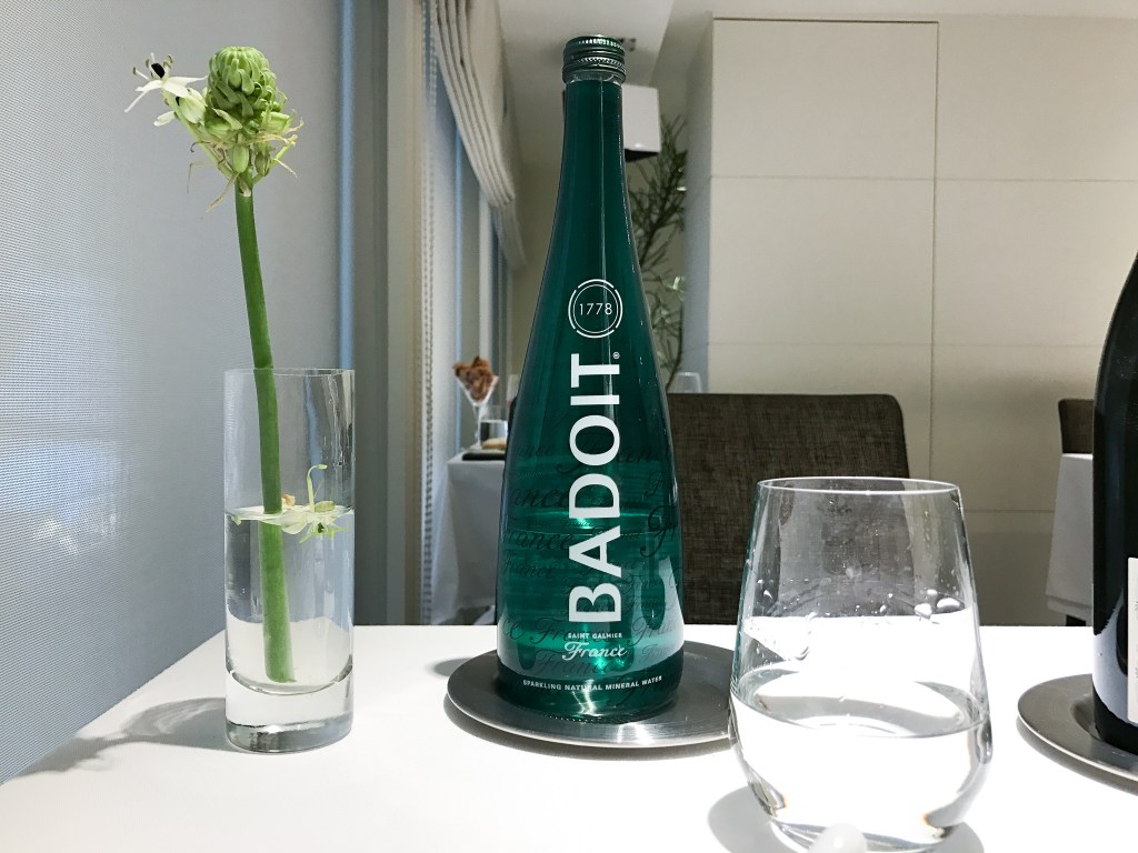 而今天的飲用水BADIOT的SPARKLING。我的習慣,當沒有常溫水,又要喝紅酒,我一定會選氣泡水,而這裡也有多款可以選擇,但我選是稍微熟悉一點的BADIOT吧。