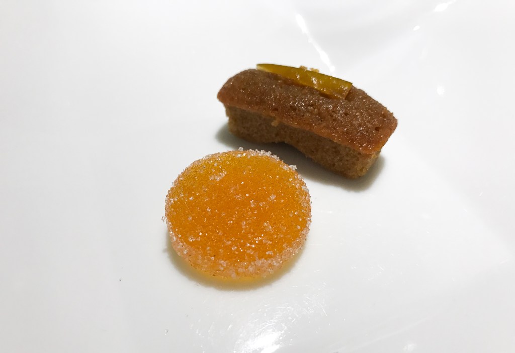 配上的小點心Petit FoursFruit「咖啡費南雪、柑橘法式軟糖」。配茶品的點心是咖啡費南雪,加了風乾橘,真的還真好吃,咖啡味重但費南雪結實不馬乎,甜蜜好吃。柑橘法式軟糖,不是百香果,酸甜美麗真是好吃啊。