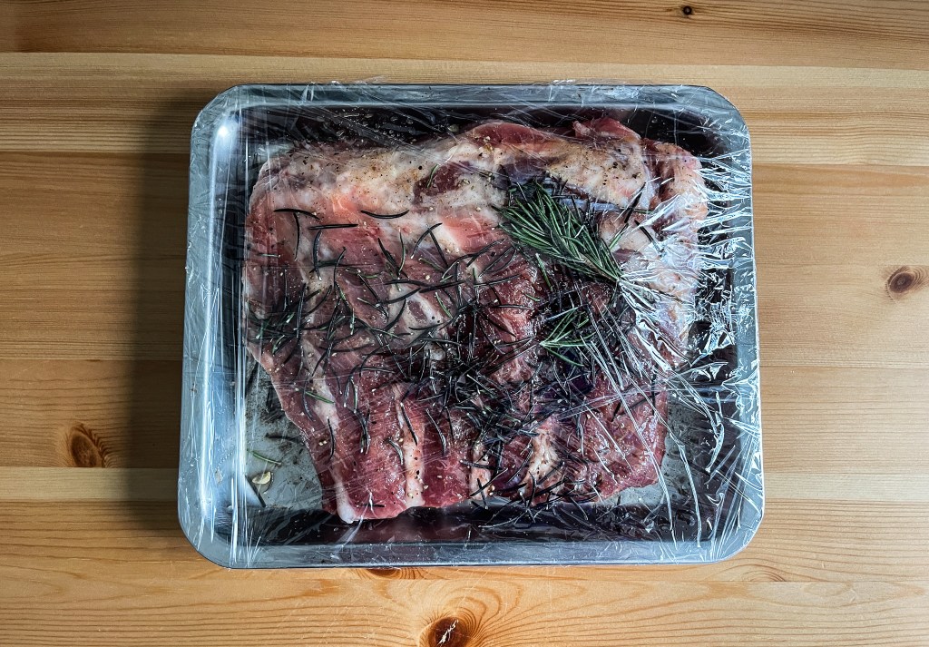 首先前一天先醃製豬腹協排,用鹽、黑胡椒、白胡椒、卡瓊香料、香蒜粉與白糖等混合,然後均勻抹在豬腹協排四面,然後淋上柳橙汁以及我多放了迷迭香以增加氣味,然後以保鮮膜包覆放進冰箱冷藏。