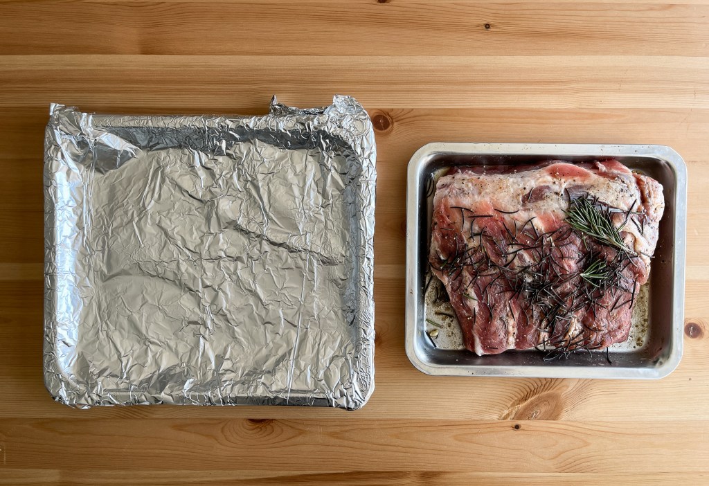第二步,製作時先將豬腹協排上的香料去除,保持乾淨並放在鋁箔紙的烤盤上。再以第二層錫箔紙包覆,四周折起,放進烤箱裡以180度烘烤90分鐘。