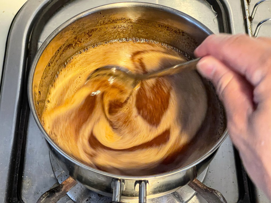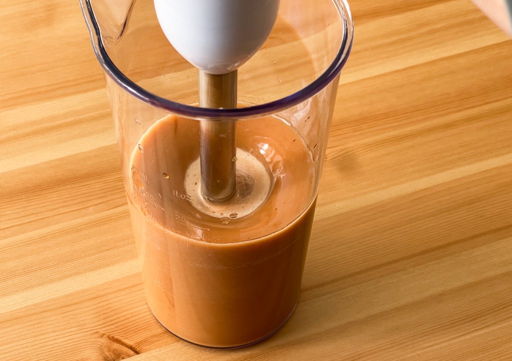 將以上材料陸續注入容器,並以調理棒攪打至濃稠。然後取出鍋子,將打好的醬汁倒入鍋中,再放入些許的黑胡椒、鹽、匈牙利辣椒粉,並加入紅糖等,餅以中小火慢煮,收至濃稠。待濃稠後再注入容器中放涼。