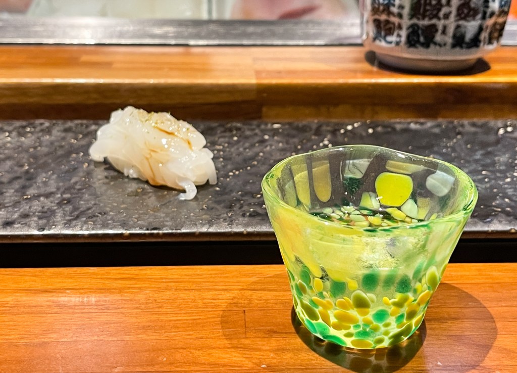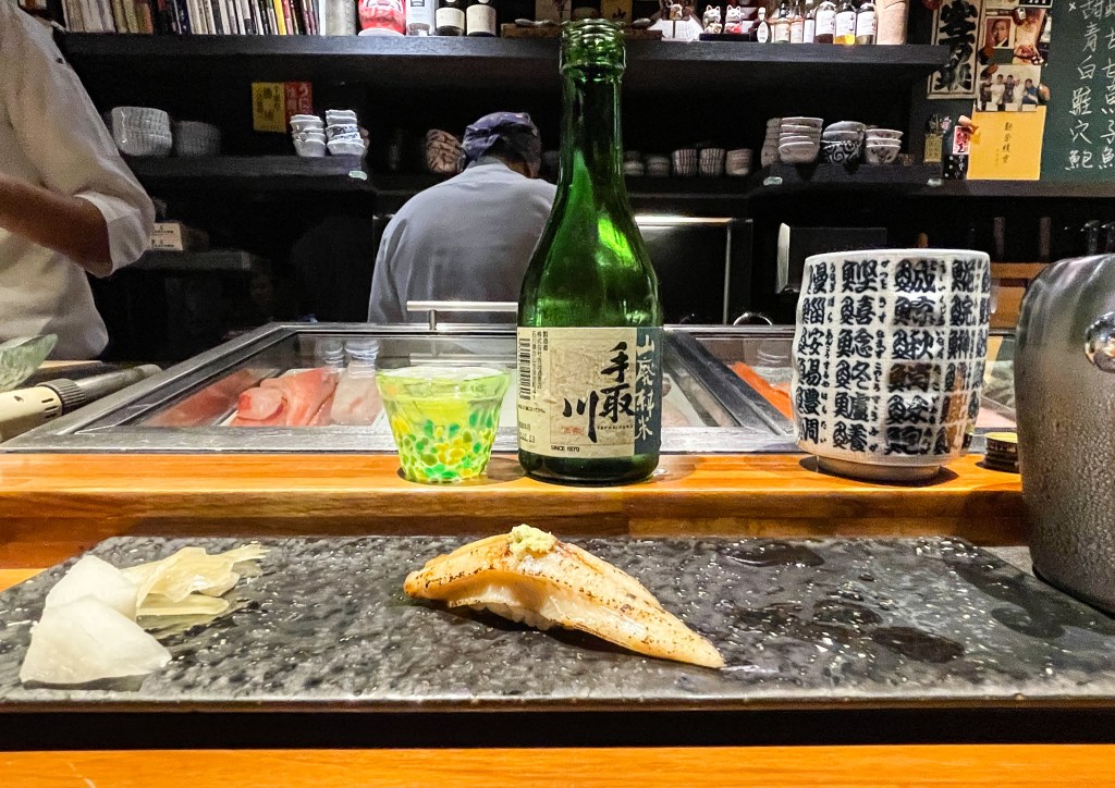 因此,這天重回座到游壽司的吧檯位置上,總有點時光不等人的感受。除了點一套握壽司套餐外,當然少不了一支清酒作陪。