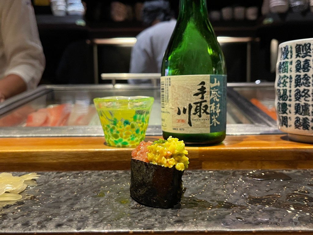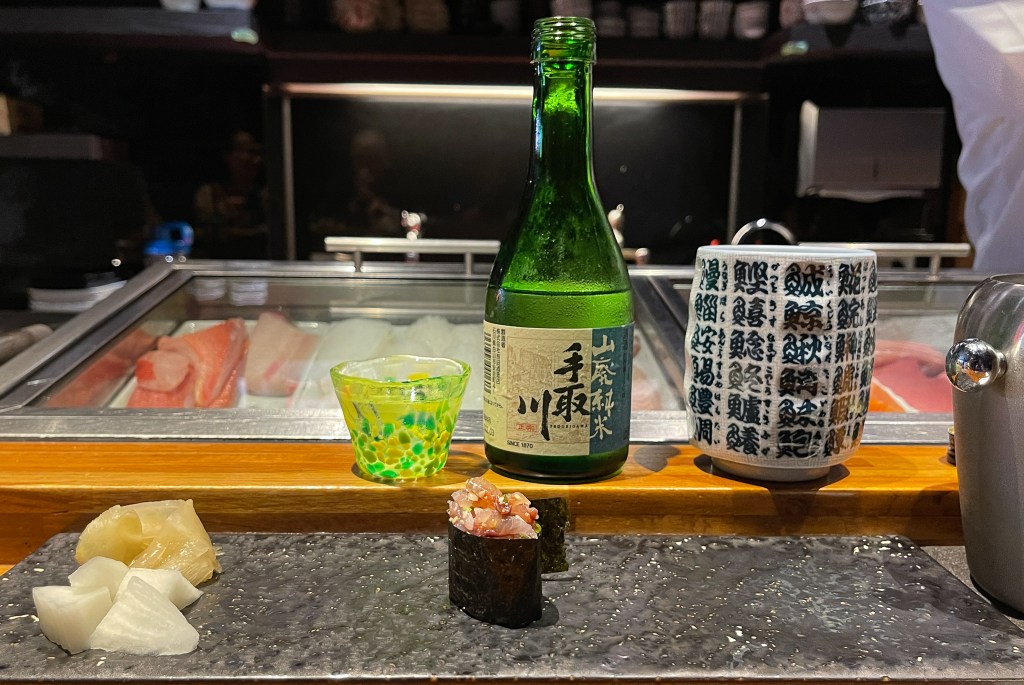 搭配手取川前味柔順而甘甜,清香甘甜,中味因為山葵而加深刺激感,尾韻的酒感較為清楚一些。