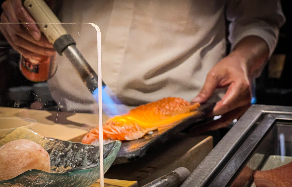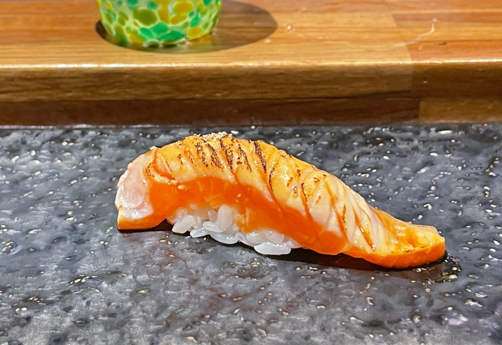 第三貫握壽司是炙燒「鮭魚」(Sake)