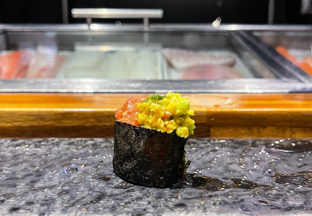 蔥花鮪魚軍艦,入口依然美好,在清香帶有微微甘甜酪梨習染的果味下,與溫和醋飯搭配滋味不錯十分和諧。