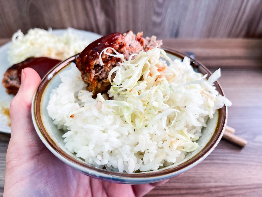 高麗菜絲搭配胡麻醬,漢堡肉是美牛台豬的喜宴,拼上紅紅的番茄調味醬汁。我切下一塊放在飯上加上點高麗菜絲,這是種儀式感,因為我可不想囫圇吞棗。