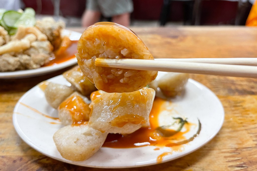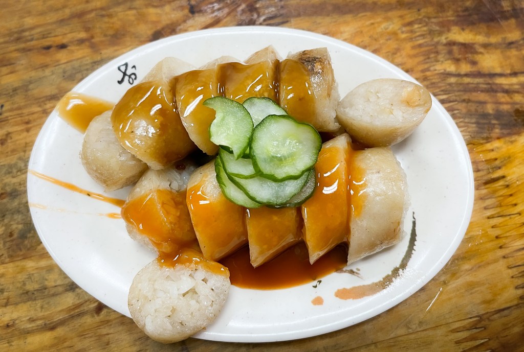 我覺得糯米腸是湯灣神奇小吃之一,用蒸或用炸,沾點海山醬或甜辣醬,都美味十足。這盤糯米腸除了淋醬之外,也附上爽脆酸甜的醃漬小黃瓜。外皮為脆,糯米熟軟蛋不爛,就是我愛吃的古早風味。