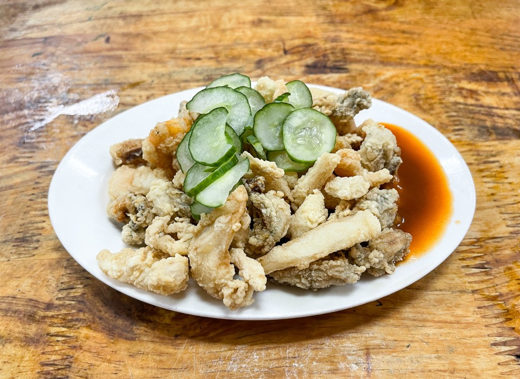 其實炸三鮮,並非是我最喜歡的料理,不過是店家幾十年的招牌。花枝、蚵仔以及鮮蝦等三鮮裹粉投入油鍋油炸,然後甩油入盤,畫瓜來一些,甜味醬料來一些,滿足五臟廟料理再來一道。