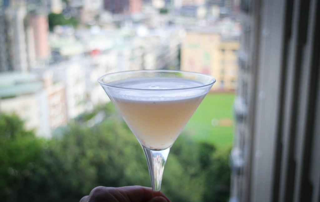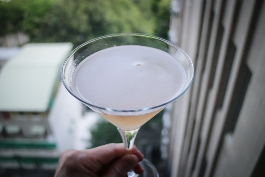 取出冰鎮杯子,將搖盪後的雞尾酒,注入三角帶梗的馬丁尼杯子中,我沒做什麼裝飾,覺得這樣剛剛好,帶一點點柚子肉,即完成今天的「海明威戴綺麗」。