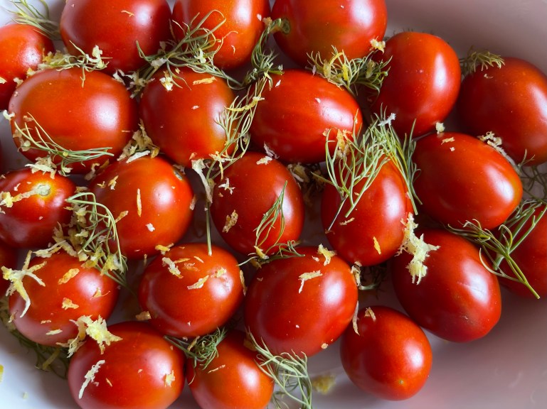 首先將蕃茄洗淨擦乾,裝進在烤碗中,然後將茴香葉撕段,平均鋪設在烤碗裡,然後再將黃檸檬皮平均刨在番茄上。