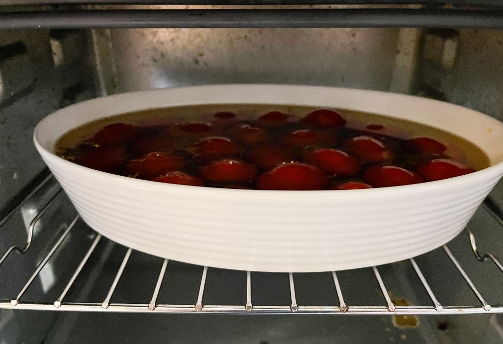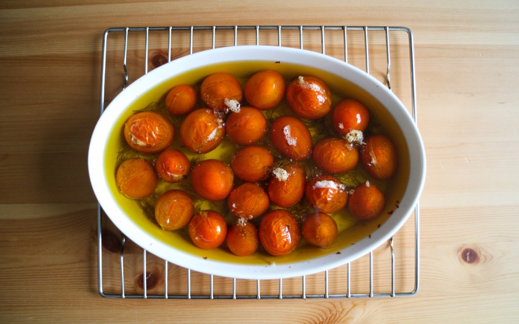 第二步,將橄欖油倒進烤碗,油的高度要蓋過番茄,達到油封效果,完成後再灑上鹽巴,平均灑在整個烤碗裡。將烤箱預熱,以110度預熱十分鐘,完成後將油封蕃茄放進烤箱以90度油封120分鐘。
