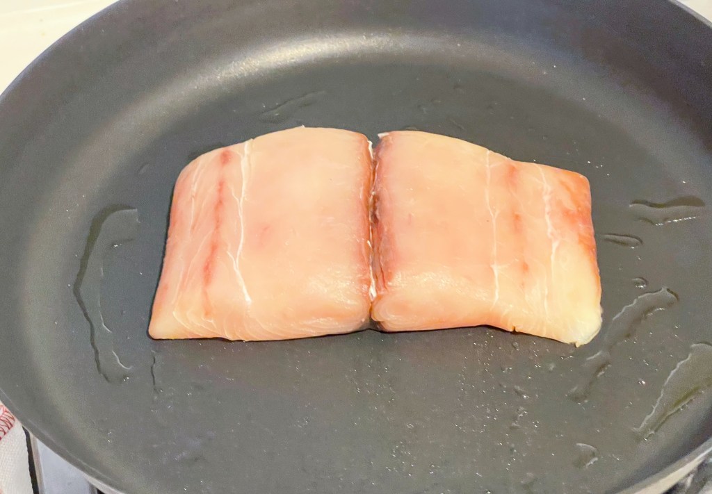 第四步,當油封蕃茄完成後,接著取出平底鍋熱鍋,淋上些許橄欖油後,開中小火,以皮面朝下開始煎鬼頭刀(注意:火太大會容易粘鍋與烤焦),兩面慢煎直至白熟。