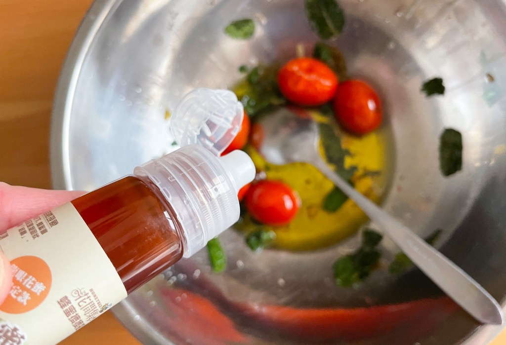 第五步,取出鍋子,將油封番茄挖取四至五顆以及些許番茄橄欖油在料理鍋裡,然後放進些薄荷葉、巴西利葉、茴香、黑胡椒、柚子鹽、檸檬汁以及蜂蜜,然後用湯匙攪拌(因為油熱,要稍微注意)。