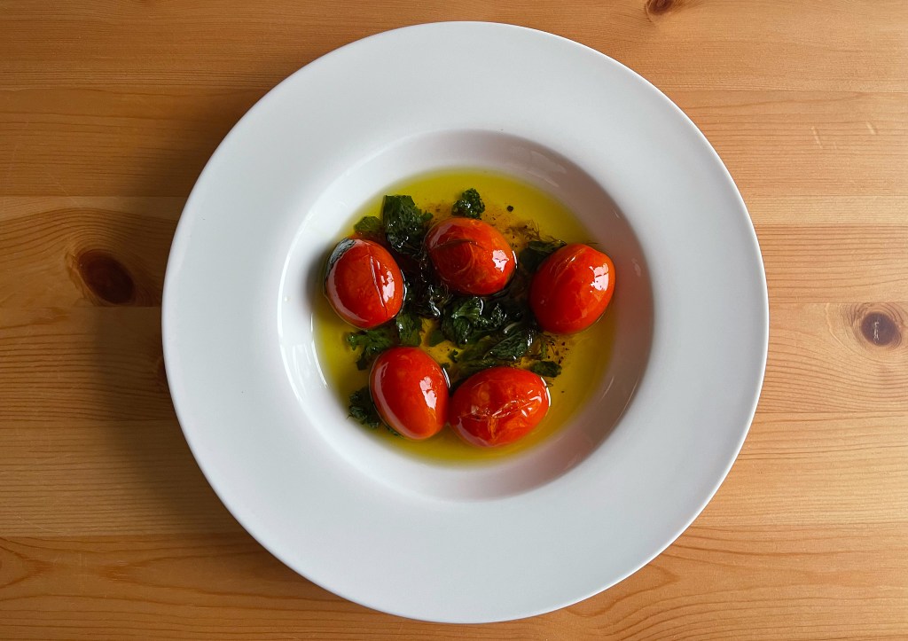 最近看完美劇「大熊餐廳」(The Bear),在最後一集時看見副主廚Sydney在家料理一道油漬番茄搭配狼鱸,忽然讓我口慾大開,腦袋開始在打轉,前前後後得倒帶,看看到底放了些什麼?於是我就採取行動。但是最近詭異的是,綜合的彩色番茄不多,好不容易找到卻是單色單盒賣,一盒就三四百元,實在不符合我所需的效益,最後還是買聖女番茄來製作,當然,要找到一模一樣的食材得費時間,像是狼鱸,我在超市裡就是沒看過,因此將冰箱裡的鬼頭刀拿出來運用替代。