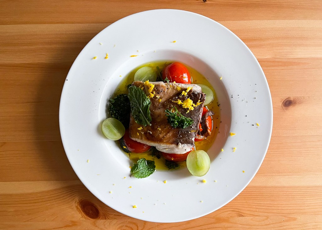 吃下,嗯,還不錯,如果鬼頭刀在用醬油醃漬風味會更鮮美,更入味一點,油封番茄美味,橄欖油中帶有番茄風味以及微微的酸香與柚子鹽感,吃的時候也會有薄荷葉淡淡香氣以及橙皮氣味。插上葡萄、番茄與魚肉一起吃,這種吃法也不違和,挺可口的。