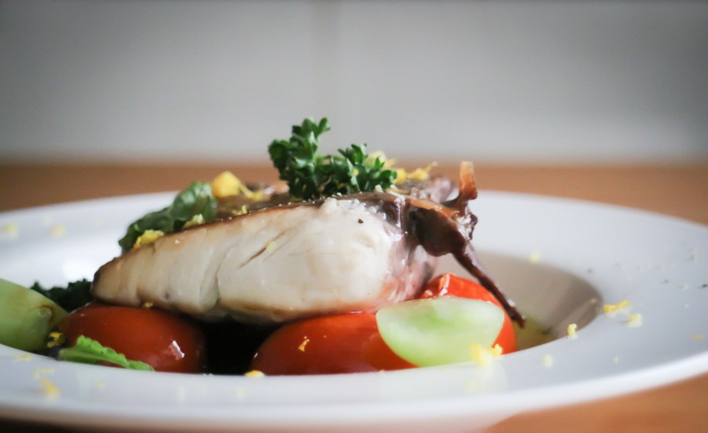 第六步,取出湯盤,將拌好的料理均勻淋進盤中,再將番茄平均置入,將鬼頭刀放上,再刨上些橙皮,再淋上些許檸檬汁,以及再撒上些松露鹽,在取些巴西利葉與薄荷葉放上裝飾,最後取出美國無子麝香白葡萄三顆切半,平均擺上,即完成料理這道突發奇想的隨興的料理「油封番茄搭配鬼頭刀」。