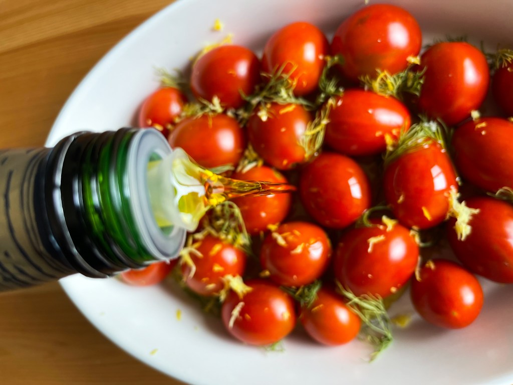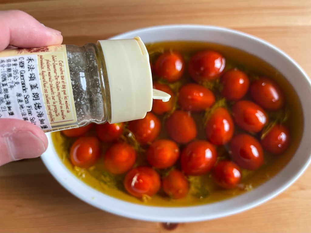 第二步,將橄欖油倒進烤碗,油的高度要蓋過番茄,達到油封效果,完成後再灑上鹽巴,平均灑在整個烤碗裡。將烤箱預熱,以110度預熱十分鐘,完成後將油封蕃茄放進烤箱以90度油封120分鐘。