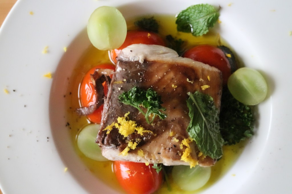 吃下,嗯,還不錯,如果鬼頭刀在用醬油醃漬風味會更鮮美,更入味一點,油封番茄美味,橄欖油中帶有番茄風味以及微微的酸香與柚子鹽感,吃的時候也會有薄荷葉淡淡香氣以及橙皮氣味。插上葡萄、番茄與魚肉一起吃,這種吃法也不違和,挺可口的。