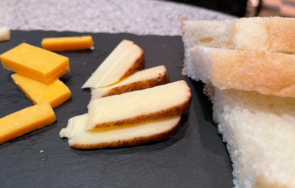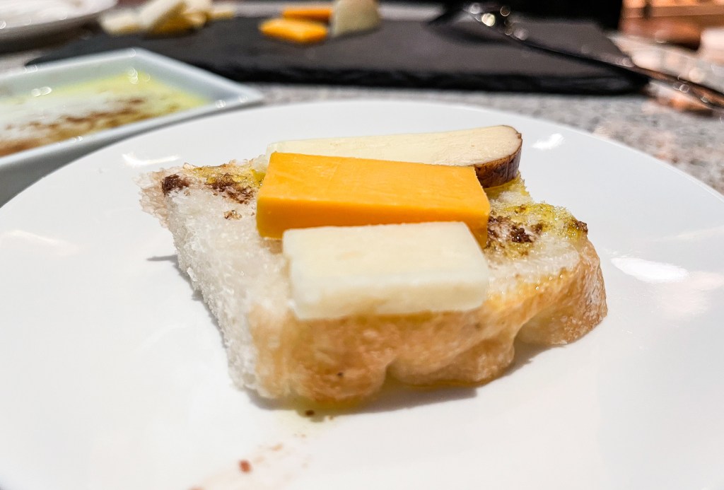 搭配「起士拼盤」(Comte、Cheddar、核桃利口酒起士、麵包以及橄欖油、油醋以及海鹽)