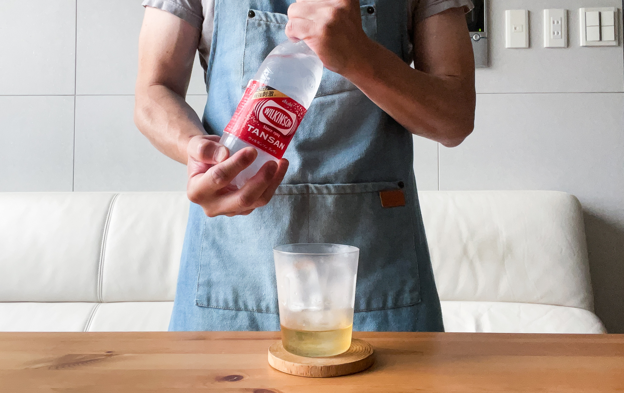 再取來Wilkinson碳水水,打開並到入杯中約8分滿,然後再以攪拌棒置入底,為攪拌一圈,並將冰塊向下壓沈一次,讓氣泡戴上威士忌,然後稍稍擠壓檸檬角在杯緣,然後置入杯中,在用攪拌棒攪拌圈,最後取出薄荷葉病稍加拍壓,放在杯上,完成一款「白州Highball」。