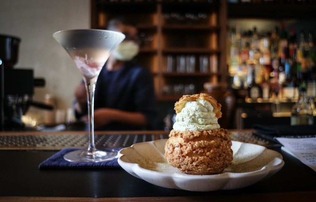 搭配抹茶泡芙,欸,似乎完全覆蓋,前端出現一種靜置寧靜置身太空般的無重力狀態,接著帶來鹽感鹹味然後抹茶鹹的濃郁自然。