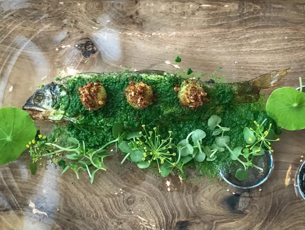 第五道是一款炸物AYU(SWEETFISH), ROQUETTE SAUCE「香魚 芝麻菜醬汁」