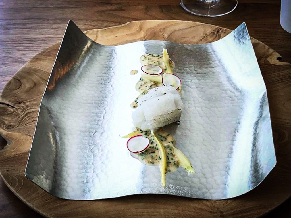 細蔥和調味的沾醬以及食用花葉,同時給了鮮白魚肉美麗滋味,醬汁鮮美魚肉軟綿。搭白酒略感乾澀,但尾端飄出優雅的果香,很舒適搭配。