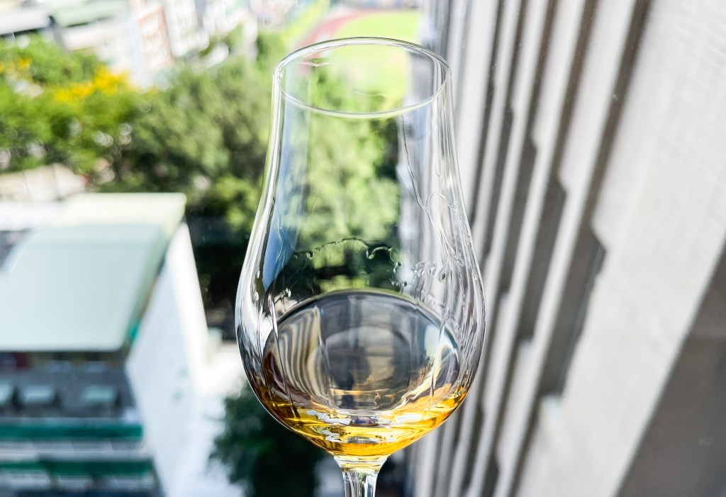色調:呈現焦糖金黃,顏色偏深也是深琥珀的表現,酒緣透明銳利,酒質純凈,搖晃之後酒淚緩慢流下,俐落潔淨。
