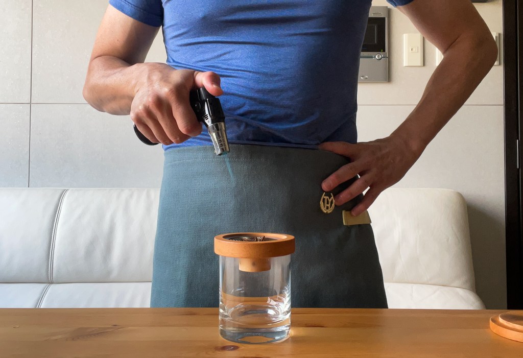 首先準備威士忌杯,然後先燃燒肉桂棒,使得煙可以在杯中環繞煙燻,然後再放入適合酒杯的方形冰塊,並以攪拌棒稍微攪拌冰杯。