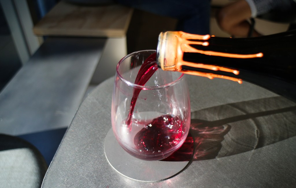 還好太陽出現了,陽光照射讓酒色的表現非常清楚,在紅酒杯裡表現的色調,在Ganache葡萄中是輕盈的,輕巧的寶石紅、紅醋栗果皮紅,亦如智利無籽葡萄的輕盈,如輕葡萄紫、桃紅、櫻桃紅,酒緣透明清晰。