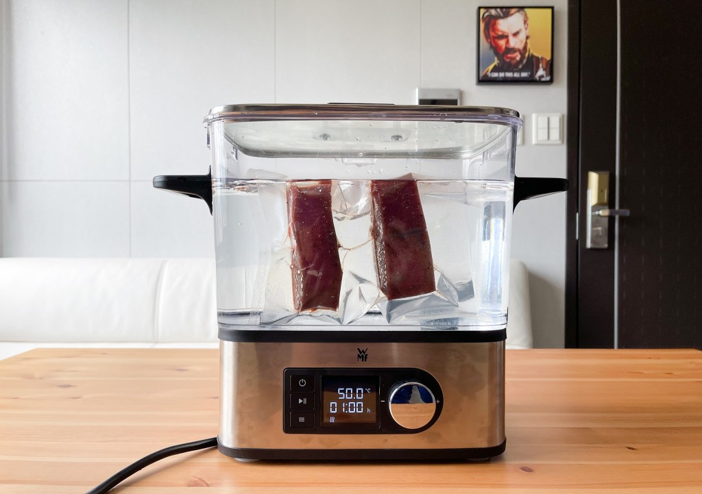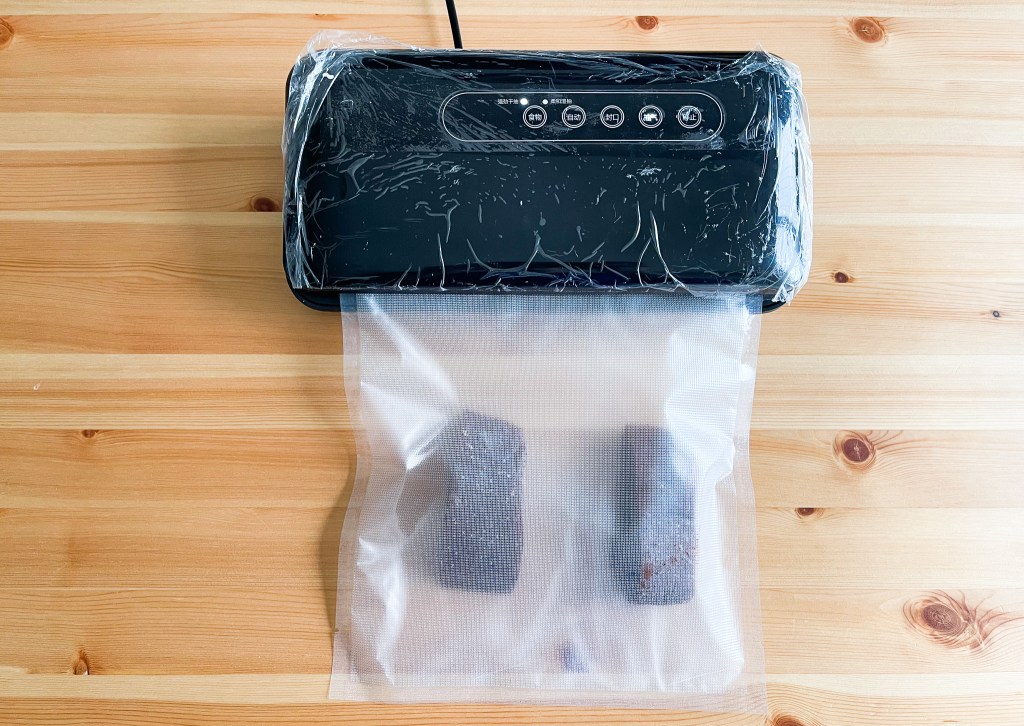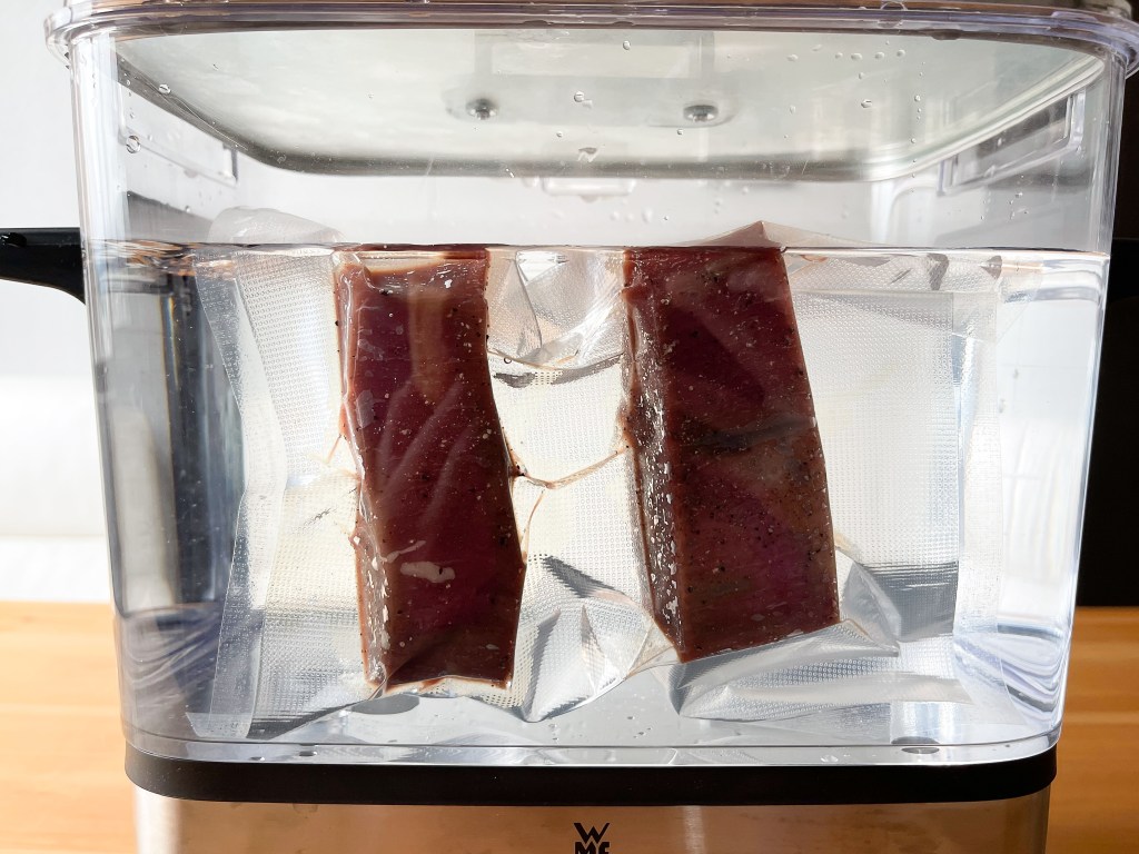 首先將醃漬好的鴕鳥肉取出,然後以密封機將肉密封起來。在準備好我的舒肥機,準備來個50度60分鐘的烹調。