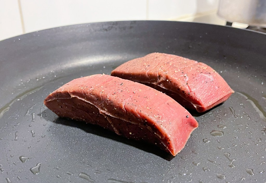我取出平底鍋加熱,再用刷子塗上橄欖油,開中小火,放上鴕鳥肉,開始慢慢煎它,直到四面環面梅納,蓋約至7分熟度後,取出靜置。
