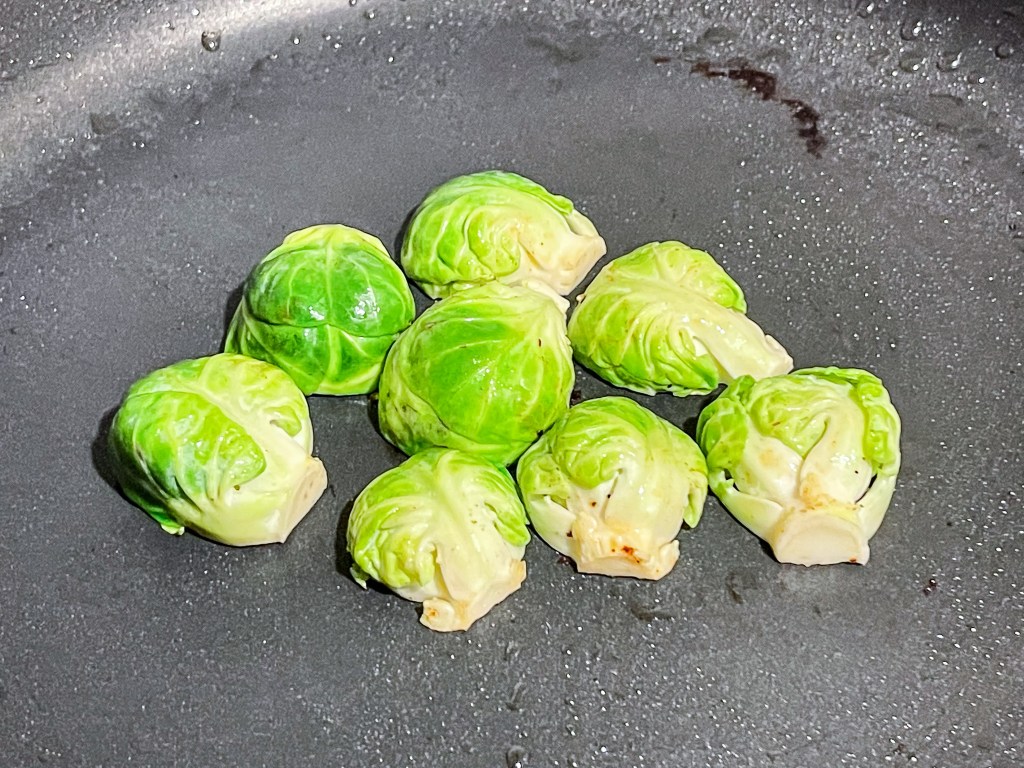 接著將孢子橄欖切半,在鍋中再添上些許橄欖油,並將孢子橄欖置入,並適時翻面煎煮,再添上些鹽巴增加味道,泛黃微焦後即可取出。