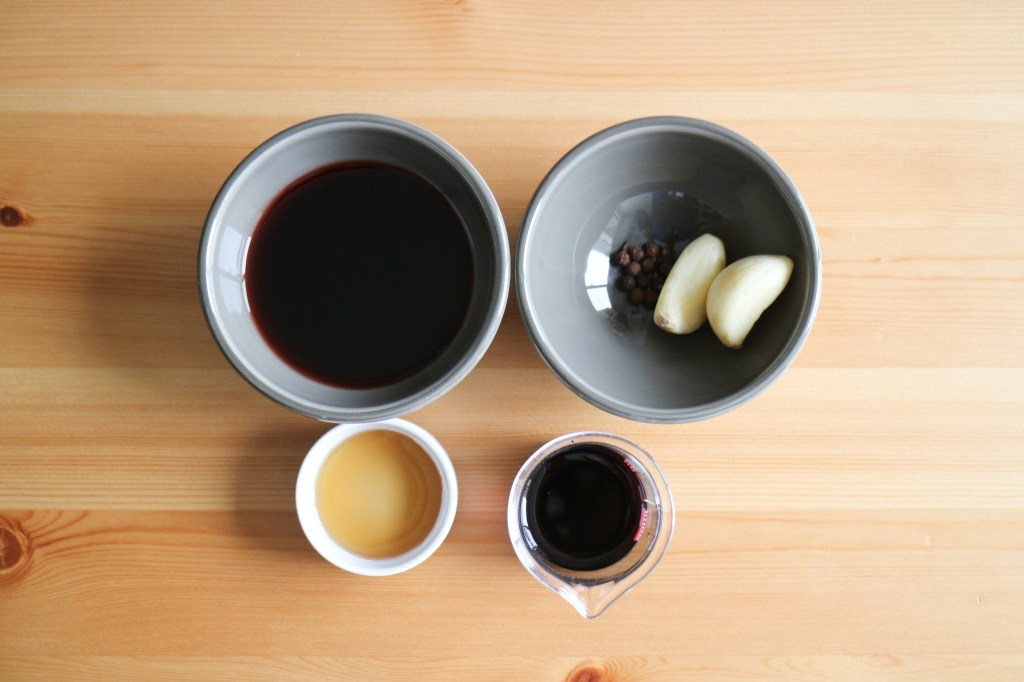 取出長柄鍋,開中火加熱,薑蒜頭馬告放入微炒,緊接著倒入紅酒、黑櫻桃果液、楓糖漿,並添加一些鹽,開始以中火收汁,然後添加些許麵粉讓醬汁產收稠密感,最後過濾至小碗中,作為今日將之使用。