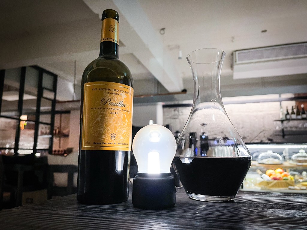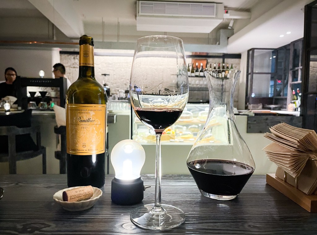 我看了酒吧酒單,House Wine就是Pauillac產區Rothschild家族的宴會酒,因此不疑有他的選擇了Baron Philippe De Rothschild Collection Waddesdon Pauillac 2017(產地:France, Bordeaux Pauillac 品種:62% Cabernet Sauvignon, 28% Merlot, 7% Cabernet Franc, and 3% Petit Verdot)。