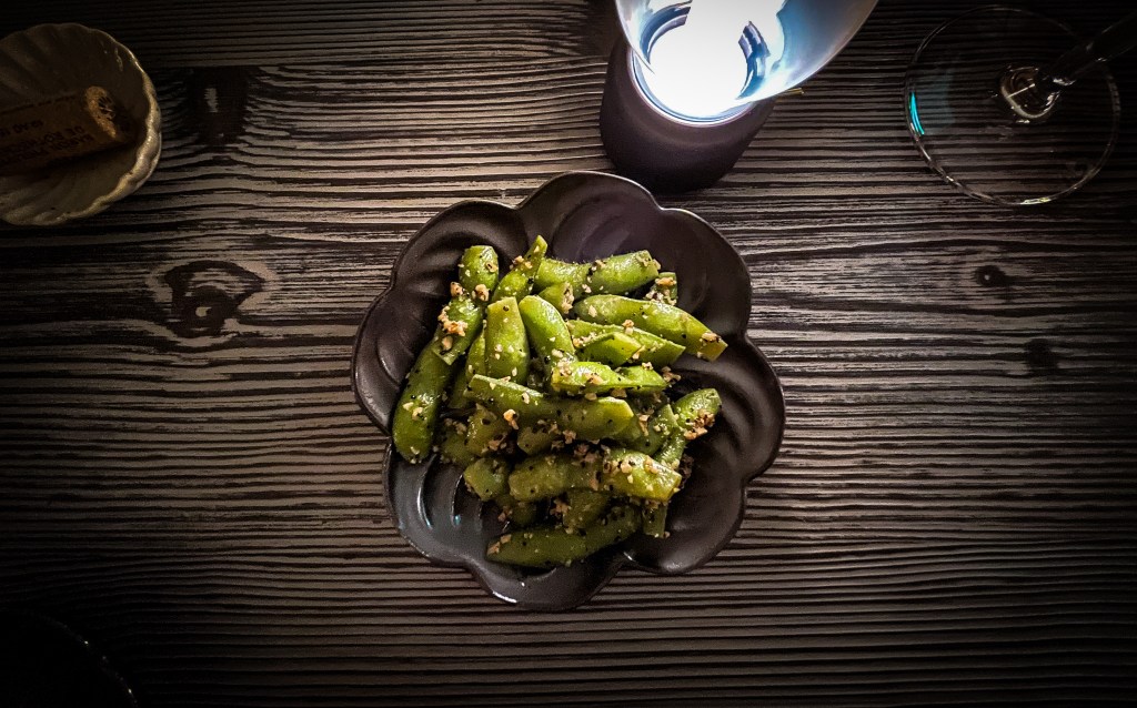 涼拌的下酒零食蒜味黑胡椒毛豆,無論在何種情境都是耍嘴好食。尤其碎蒜黑胡椒交錯帶著輕盈的辣味,毛豆自然涼爽咬下微硬的外層而內已是微軟入口的好味道。