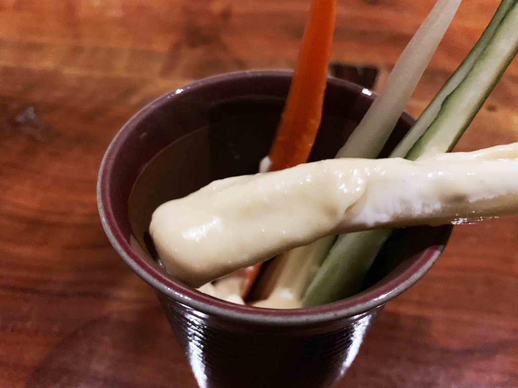 看到有蔬菜棒,其實還挺訝異也挺納悶的,晚上吃蔬菜棒,應該是為了「喝酒傷身,蔬菜棒養生」吧。
