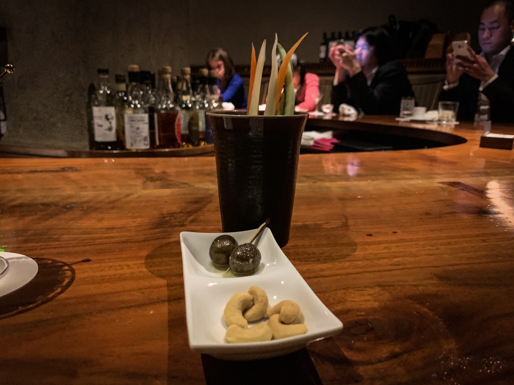 第二樣是佐酒零食(蔬菜棒、醃漬橄欖、腰果)