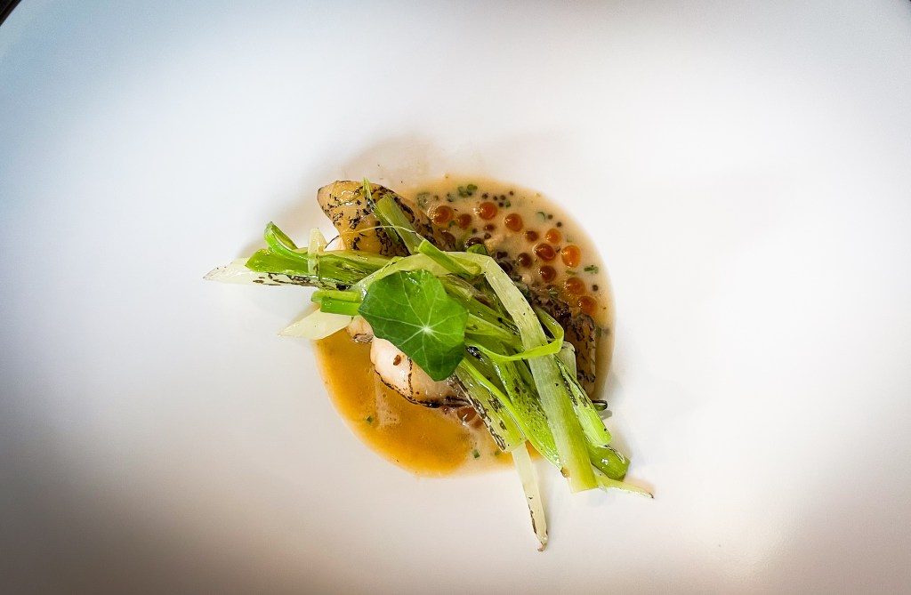 第六道料理是搭配海味Tiger Giant Grouper, Shio Kumbu, Salmon Roe, Caviar, Ditch Lily(龍虎斑 鮭魚卵 魚子醬 碧玉筍)。