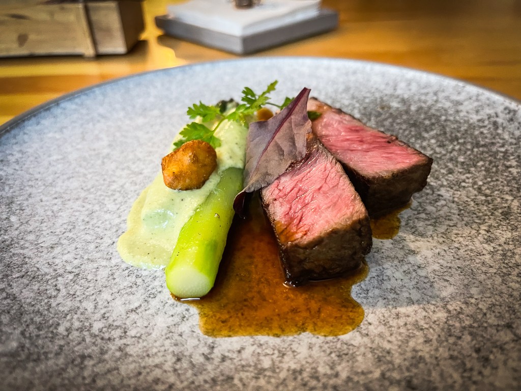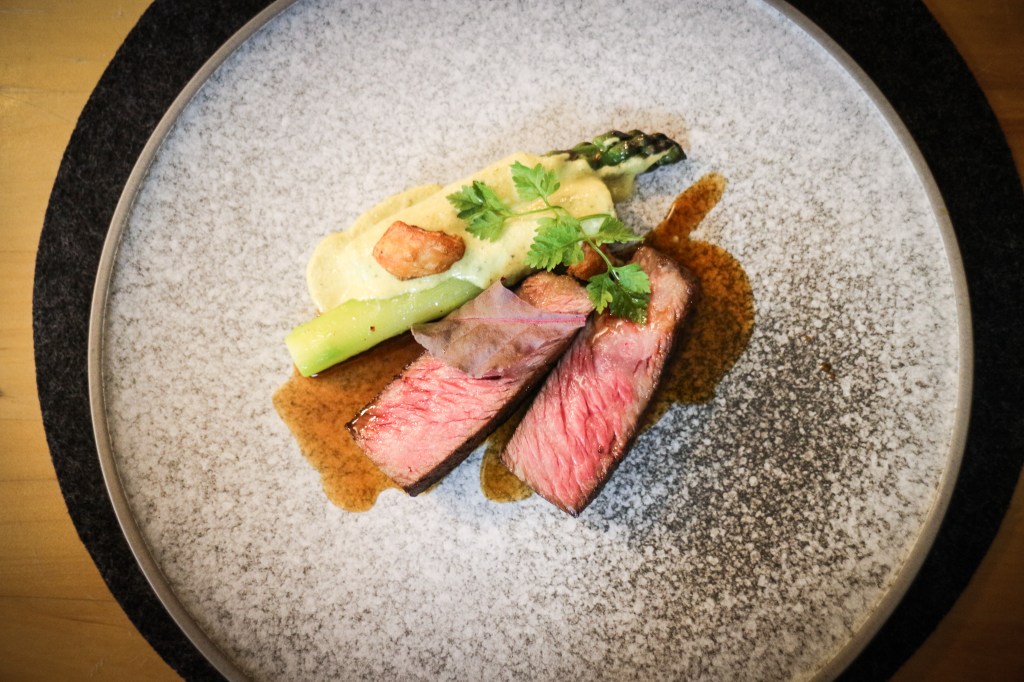 第七道是主餐Asparagus, Water Caltrop, Seasonal Vedgetable(牛小排 蘆筍 菱角酥 季節時蔬)。
