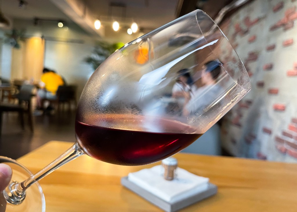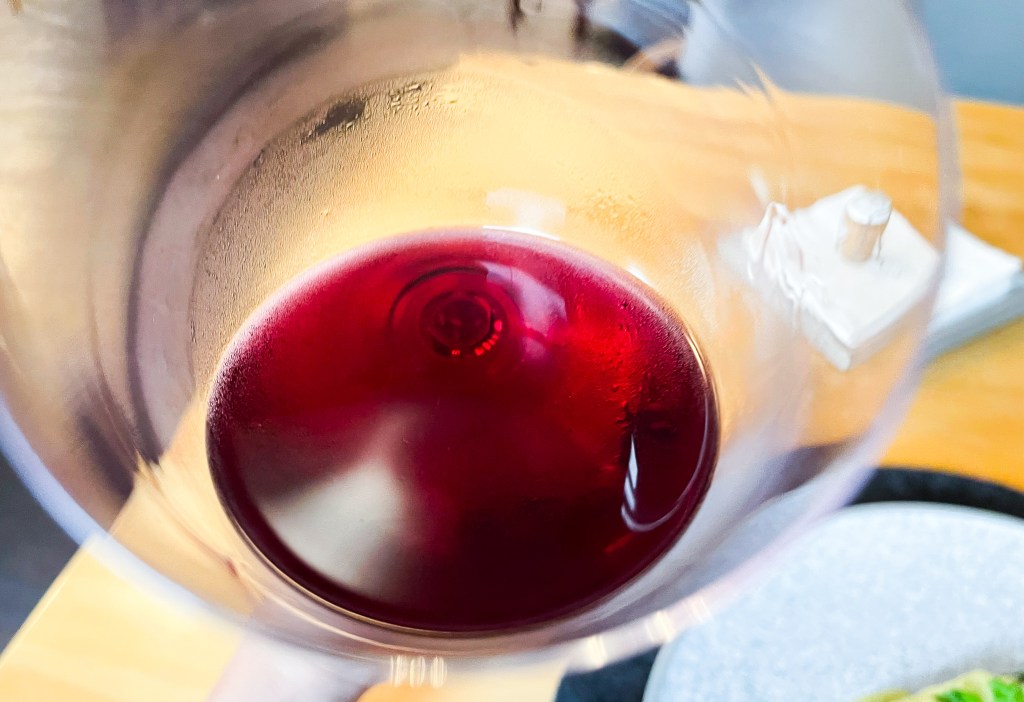 這款酒表現出的色調並非深紅而是透測的、寶石紅、紅醋栗果、酒緣銳利、邊緣從透明、肉膚色、酒紅而寶石紅,冰涼透測的自然酒搖晃後讓酒緣自然滑落,優雅乾淨。