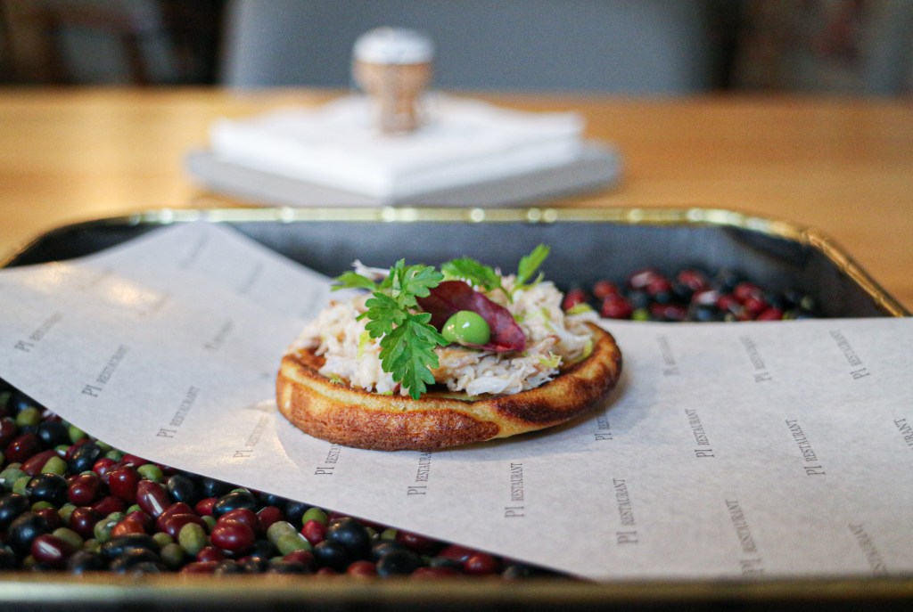 節奏挺快的的,而第二道料理也是今天的前菜Crab, Potato Blini (貝里尼 秋蟹)以一種Tapas方式呈現。