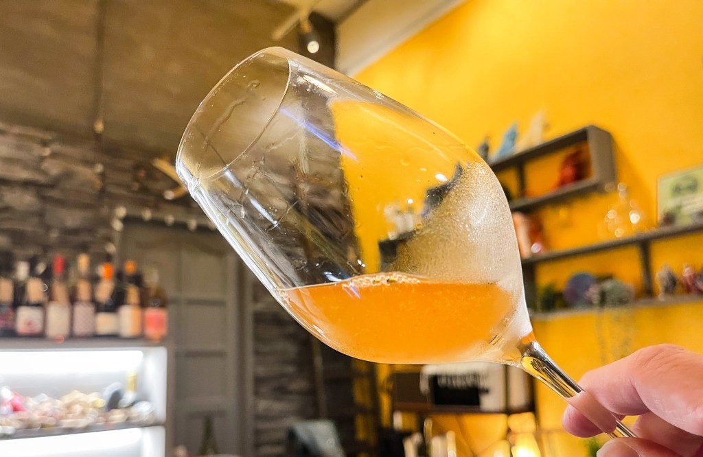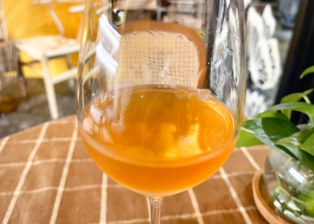 剛開瓶有點微氣泡滋味,但散去空氣後就不會再有,酒腿亮麗銳利,慢慢滑落優雅自然,不過這款酒本身就無過濾存在著大量的酒渣,是很自然的橘酒。