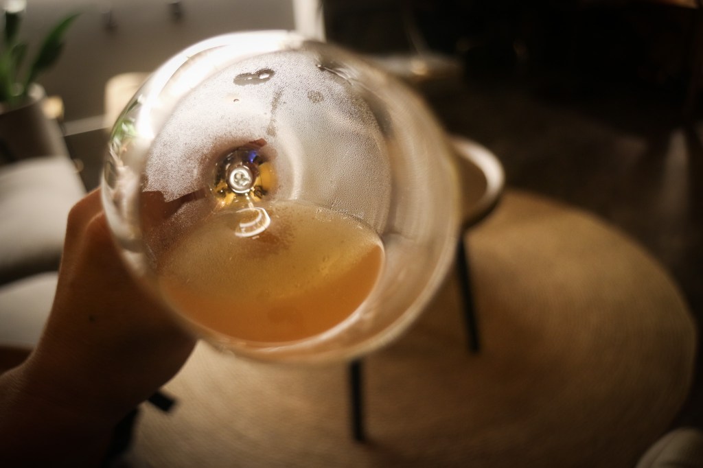 而在自然埕裡,店主似乎與Laurent同樣有著灑脫的個性,介紹自家產品變直爽的說明了價格範圍以及經營風格。首先他幫我冰鎮了這款橘酒,為了加速冰鎮,他使用鹽讓冰塊穩固凝結而不分散,使冷空氣集中因此加速了酒的降溫。開好酒後,便將酒倒入SCHOTT ZWIESEL的葡萄酒杯中。